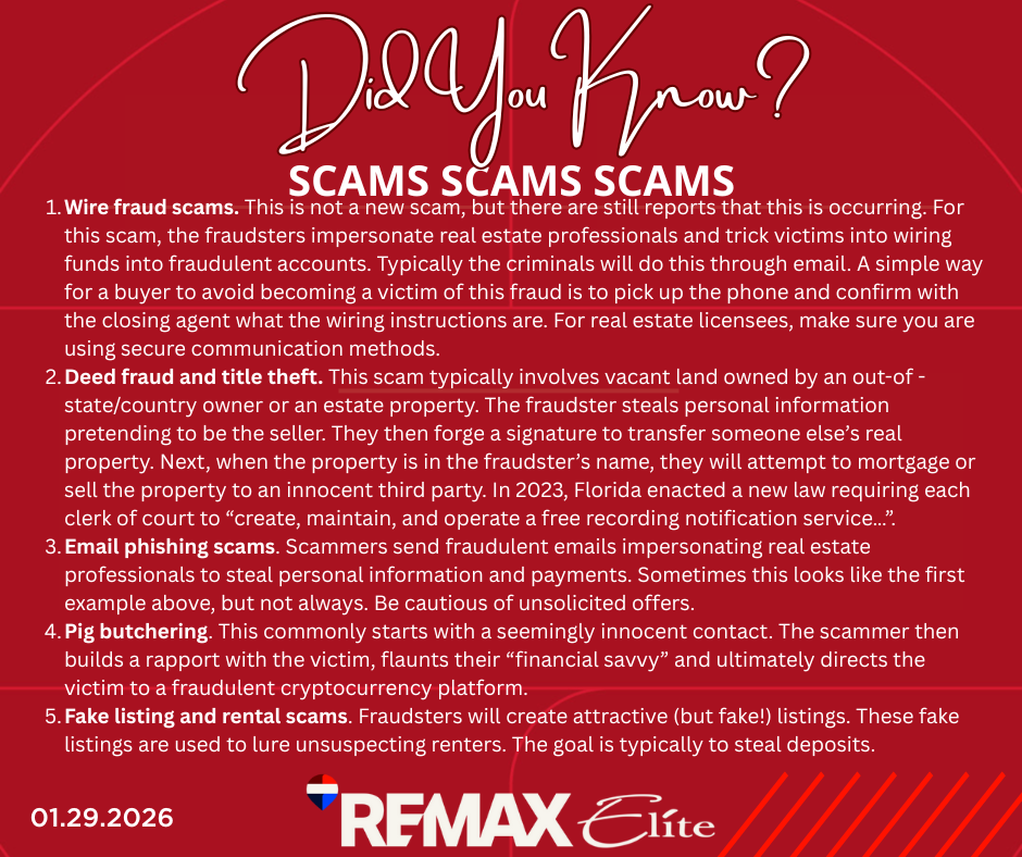 Wire fraud scams. This is not a new scam, but there are still reports that this is occurring. For this scam, the fraudsters impersonate real estate professionals and trick victims into wiring funds into fraudulent accounts. Typically the criminals will do this through email. A simple way for a buyer to avoid becoming a victim of this fraud is to pick up the phone and confirm with the closing agent what the wiring instructions are. For real estate licensees, make sure you are using secure communication methods.